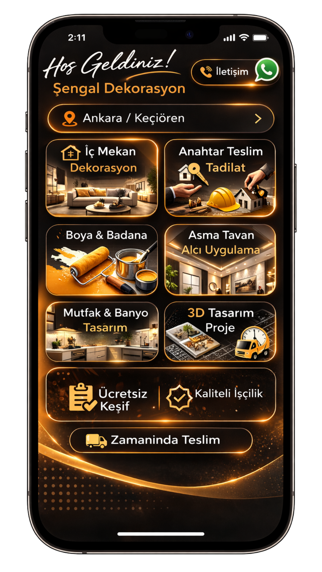 Şengal Dekorasyon olarak ev, ofis ve iş yerleri için modern, estetik ve fonksiyonel dekorasyon çözümleri sunuyoruz. Ankara Keçiören ve tüm Ankara’da anahtar teslim tadilat ve iç mekan yenileme hizmetleri sağlıyoruz.